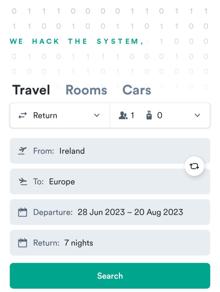 Fill in your details on the app. Try to be as flexible as possible with the ‘From’ and ‘To’ fields. You will see on the screenshot below I have put in ‘Ireland’ in the ‘From’ field, this means that the app will look for flights from all Irish airports. In the ‘To’ field you will see that I have put ‘Europe’, so the app will search for flights to all destinations in Europe. You can be more specific with these fields if you need to be but the more broad you are, the more likely it is that you will be successful in finding cheap flights for these peak periods.