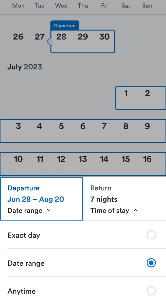 Next up is the ‘Departure’ and ‘Return’ fields. More often than not people will pop specific dates in here for the departure and return. By doing this you are limiting the likelihood of you finding cheap flights. Instead I would recommend popping a date range into the ‘Departure’ field. You will see on the screenshot below that I have popped in a date range of 28th June – 20th August. This covers the full school holiday period. In the return section I have chosen 7 nights as the ‘Time of stay’. You can choose any number of nights or even a range of 7 – 10 nights, 7 – 14 nights etc. This refers to the time between your departure and return flights or the amount of days you will be at your destination.
