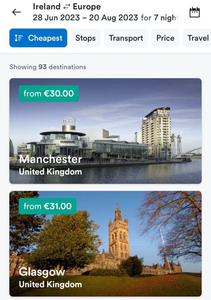 Once you press search you will see a list of destinations with starting prices of return flights based on your search criteria. Next you want to tap the tab in the top left corner to filter by ‘cheapest’.