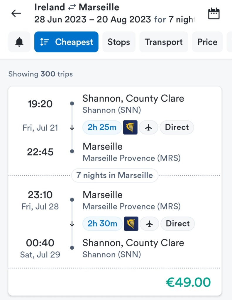 Scroll through all of the results until you find something that appeals to you. In the image below you will see I have clicked into the result for ‘Marseille’. There are over 300 results for ‘Marseille’, with the cheapest option being €49 return: Shannon to Marseille 21st July – 28th July with Ryanair. Now that’s not bad at all for peak summer time.